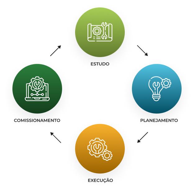 Projetos que estão em fase de execução, testes ou ajustes finais, com escopo claramente definido e interface diária com engenharia contratante e concessionárias.